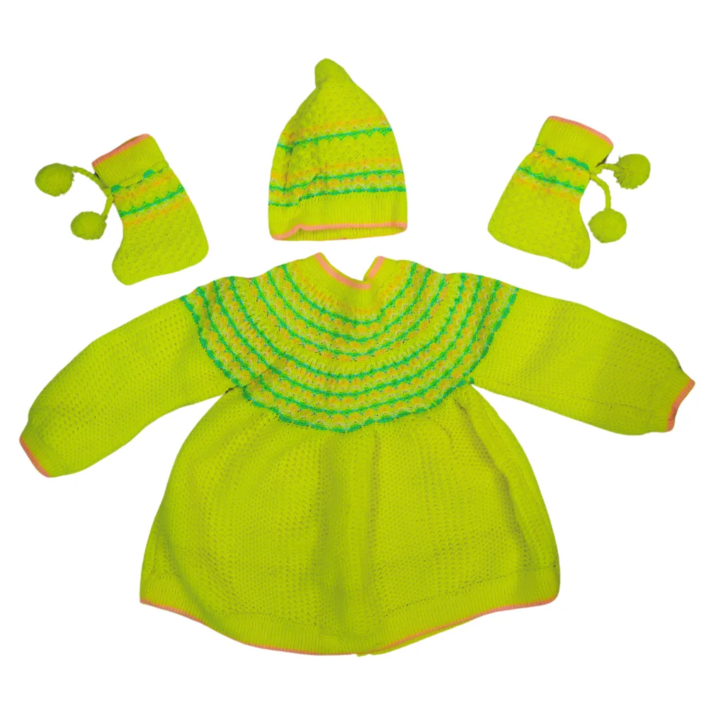 2026 Lemon Baby Girl Woolen Set - Handmade Knitted Frock, Cap & Booties | Unisex Newborn Outfit