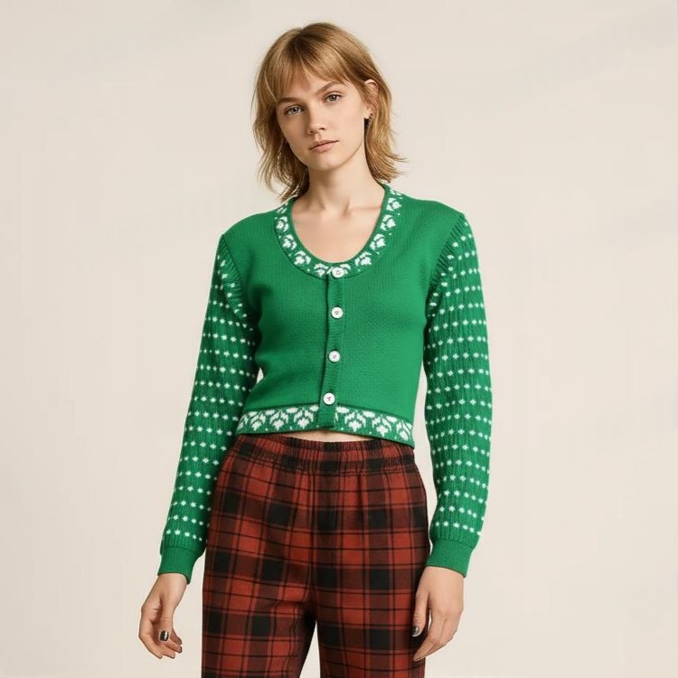 Green & White Dotted Flower Woolen Blouse Sweater for Women – Stylish Winter Wear