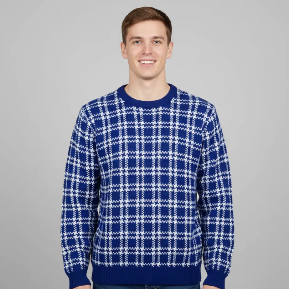 Men's Blue & White Checkered Crew Neck Sweater - Classic Knitwear Jumper